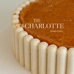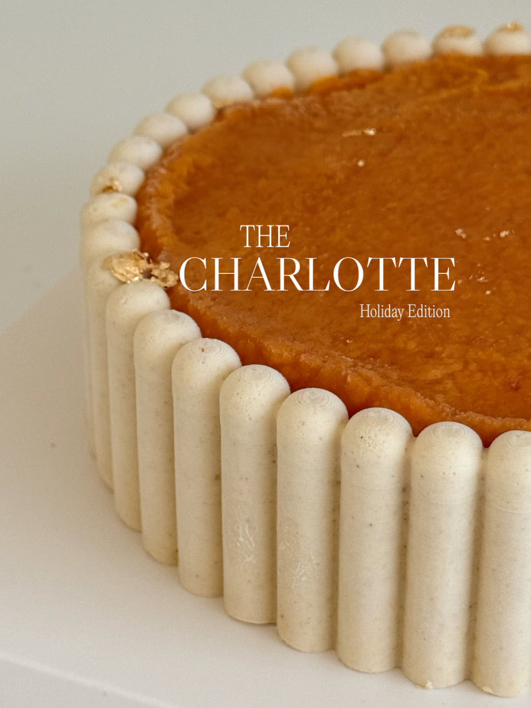 A modern take on the classic French entremet: our Charlotte is light, layered, and luxuriously finished. Each cake is wrapped in a velvety exterior and filled with delicate mousses, sponge, and complementary textures. Topped with seasonal garnishes and edible gold for a refined, sculptural finish.