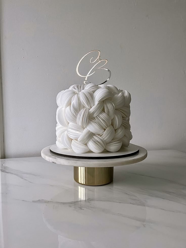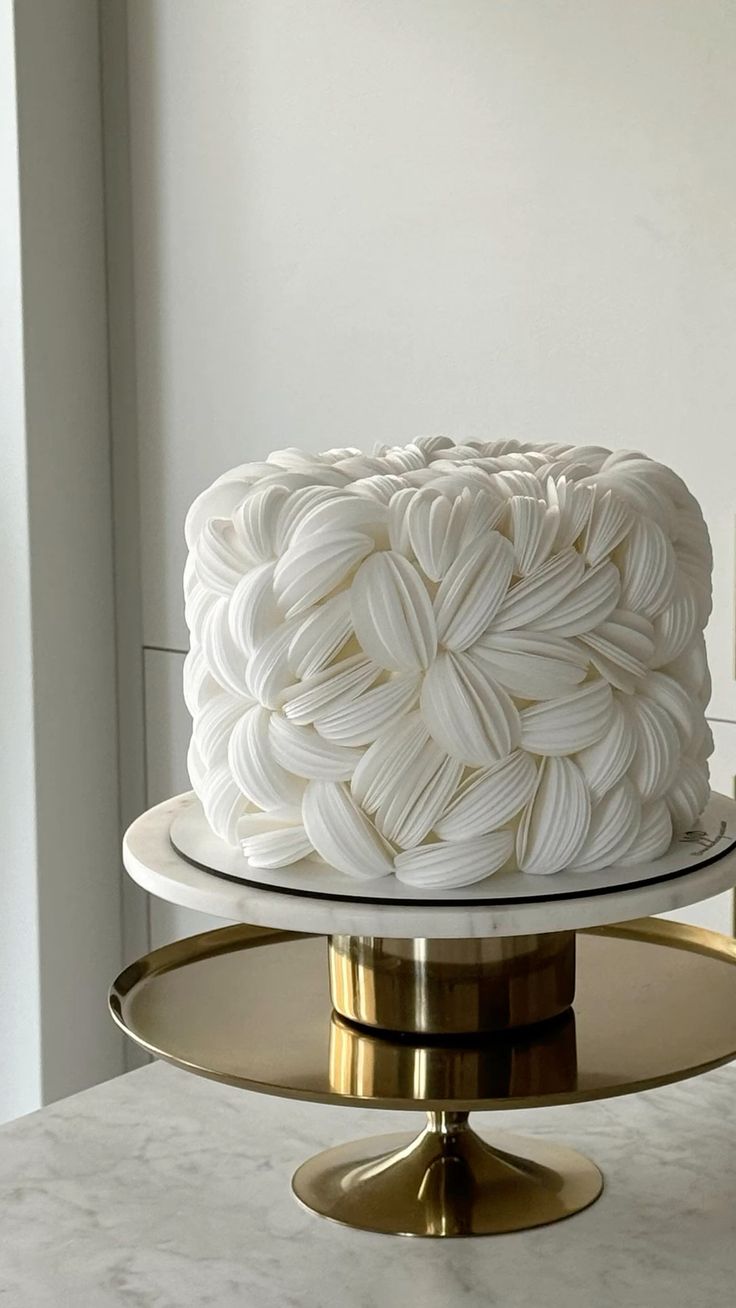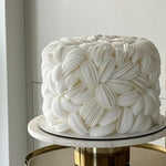 An architectural cake wrapped in delicate, petal-like layers of white that flow like drifting clouds. Its sculptural form and ethereal finish create a dreamy centerpiece, designed to bring quiet elegance and modern artistry to any celebration.